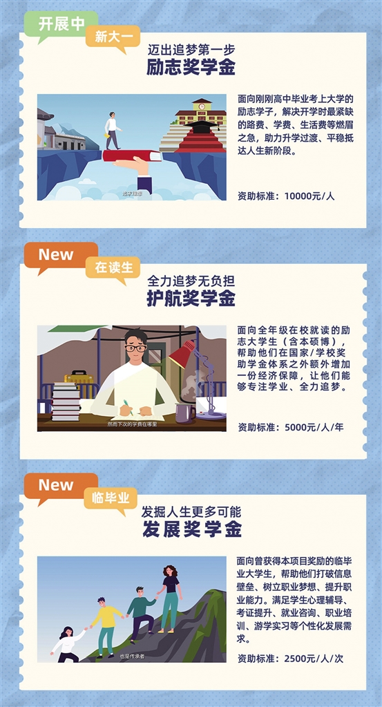 今年高考分?jǐn)?shù)揭曉在即,項目升級為“夢想+”大學(xué)生助力計劃,除繼續(xù)重點獎勵剛考上大學(xué)的勵志新生每人1萬元“勵志獎學(xué)金”外,之后學(xué)生在本碩博直到臨畢業(yè)期間,如有困難仍可繼續(xù)申請“護航獎學(xué)金”(5000元/人/年)和“發(fā)展獎學(xué)金”(2500元/人/次)。為了能夠讓更多學(xué)子獲得獎學(xué)金,今年項目繼續(xù)聯(lián)合杭州嘉互助學(xué)基金會開通公募渠道,公募款將100%用于獎勵勵志學(xué)子。