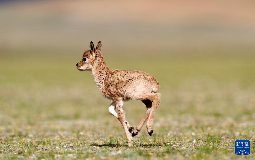 小藏羚羊在魯確塘草原上奔跑著(6月17日攝)。新華社記者 普布次仁 攝