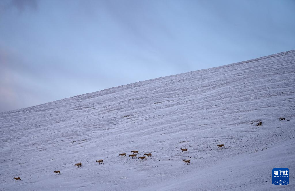 大群遷徙的藏羚羊翻越覆蓋著積雪的山梁(5月10日攝)。新華社記者 姜帆 攝