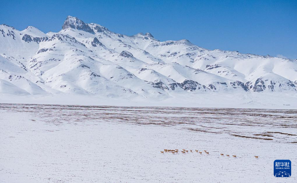 藏羚羊在甜水河畔雪地荒灘上向產(chǎn)羔地遷徙(6月15日攝)。新華社記者 姜帆 攝