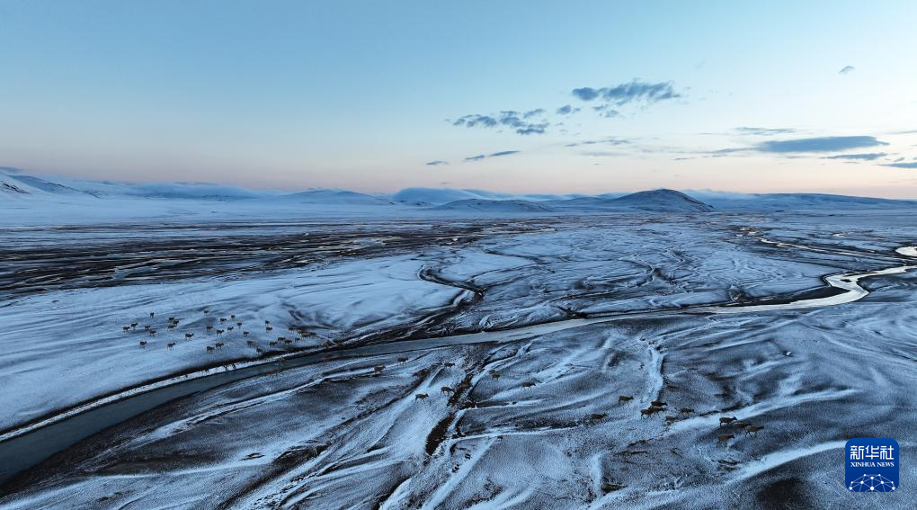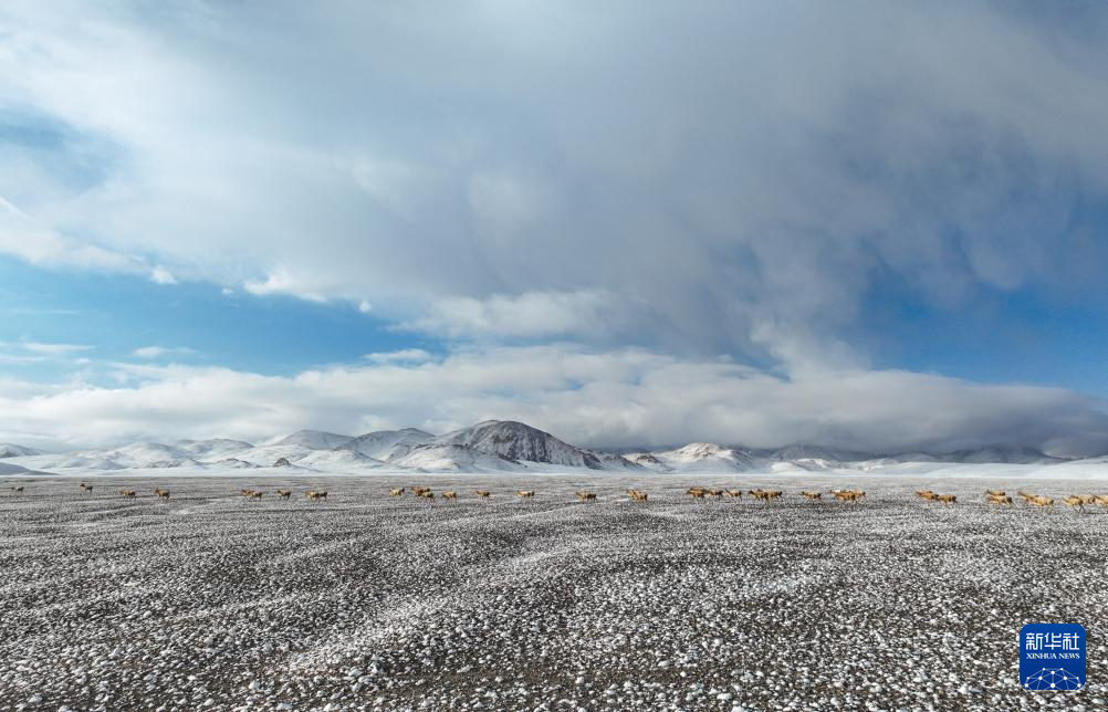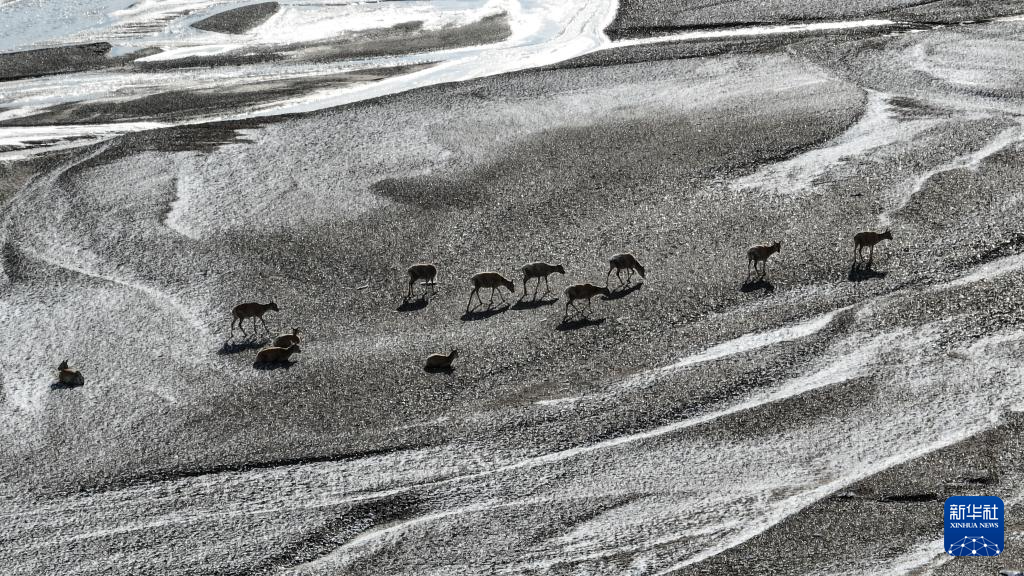 在甜水河畔荒灘雪地中向產(chǎn)羔地遷徙的藏羚羊(6月14日攝,無人機(jī)照片)。新華社記者 普布次仁 攝