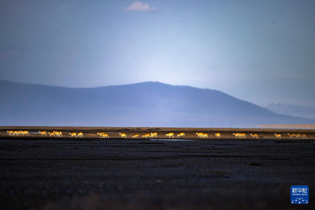 6月13日傍晚,在羌塘國家級(jí)自然保護(hù)區(qū),一群藏羚羊在遷徙中。新華社記者 費(fèi)茂華 攝