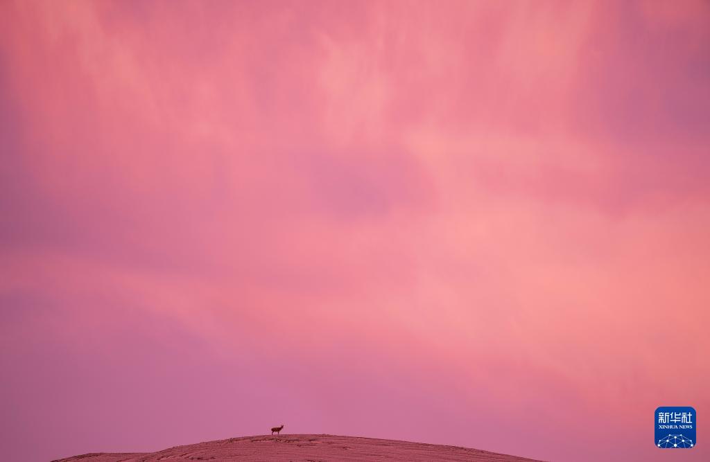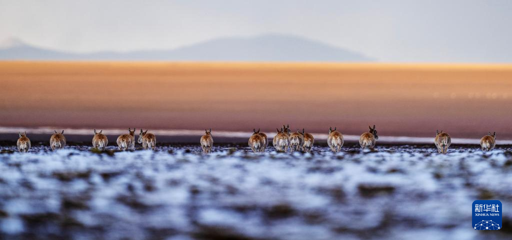 6月15日清晨雪后,在羌塘國家級(jí)自然保護(hù)區(qū),迎著朝霞前行在遷徙路上的一群藏羚羊。新華社記者 費(fèi)茂華 攝