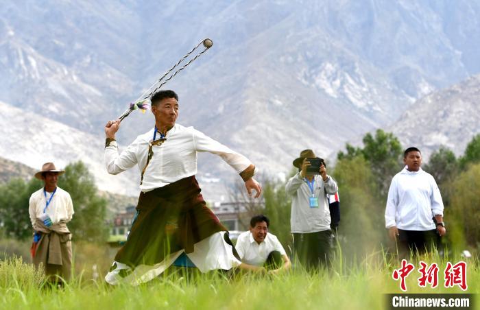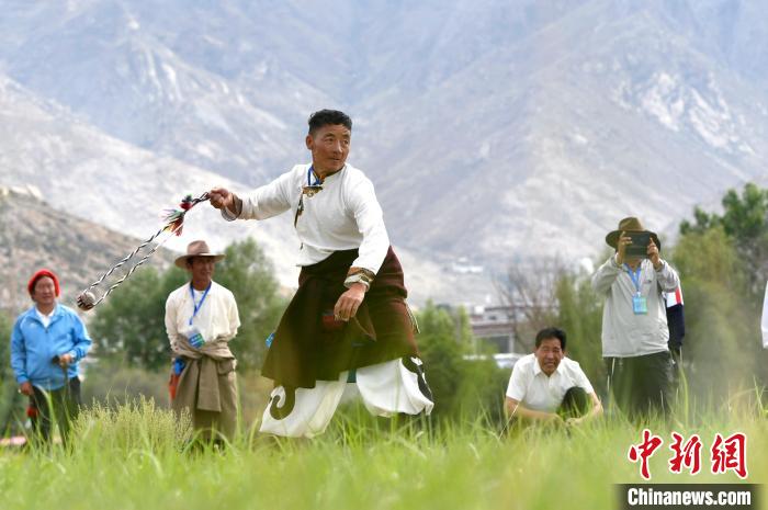 古朵指的是用牦牛毛或者山羊毛編織成的拋石繩,可以將石頭投擲到較遠(yuǎn)的地方,是牧民們用來放牧的工具。圖為6月23日拉薩首屆農(nóng)牧民運動會上,參賽選手正進行古朵比賽。中新社記者 李林 攝