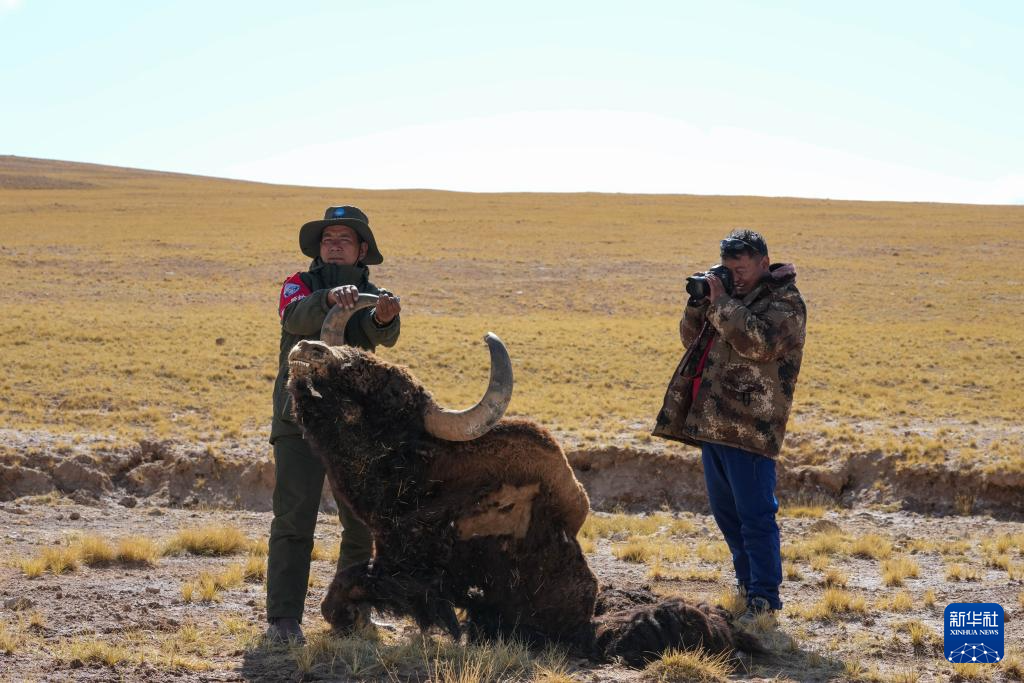 6月13日,羌塘國(guó)家級(jí)自然保護(hù)區(qū)野生動(dòng)物專(zhuān)業(yè)管護(hù)隊(duì)員在檢查一頭野牦牛的尸體。新華社記者 旦增尼瑪曲珠 攝