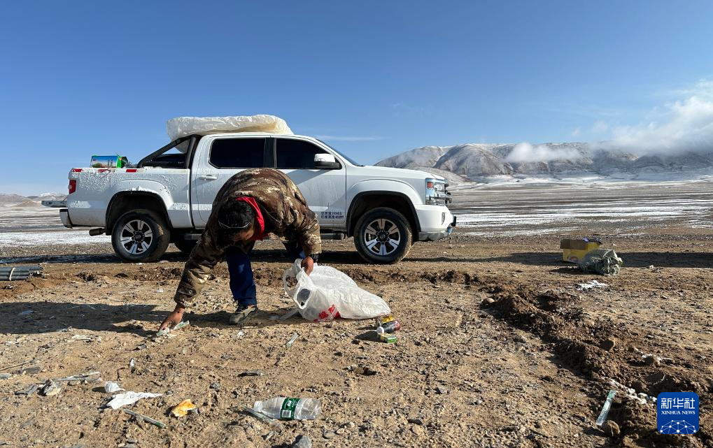 6月15日,格桑倫珠在撿拾宿營(yíng)地的垃圾,準(zhǔn)備裝車(chē)帶走。新華社記者 費(fèi)茂華 攝