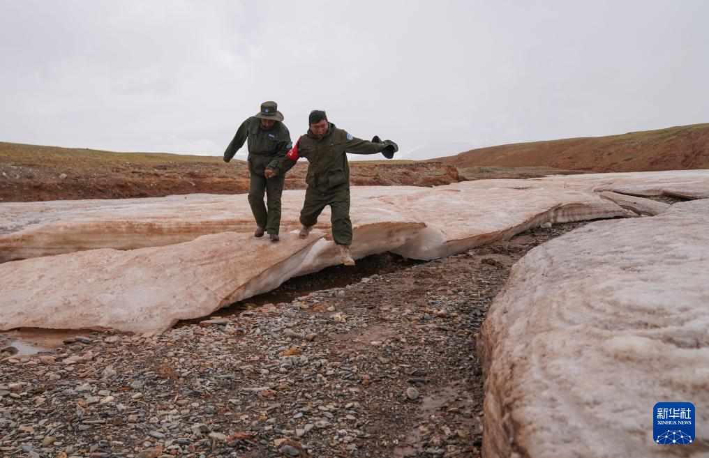 6月15日,羌塘國(guó)家級(jí)自然保護(hù)區(qū)野生動(dòng)物專(zhuān)業(yè)管護(hù)隊(duì)員索朗(左)和羅布檢查河面冰凍情況。新華社記者 晉美多吉 攝