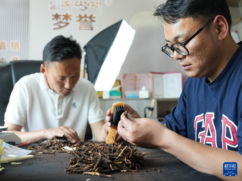 5月31日,在西藏拉薩市,藏族青年羅拉(右)在公司內(nèi)清潔新鮮蟲草。新華社記者 丁汀 攝