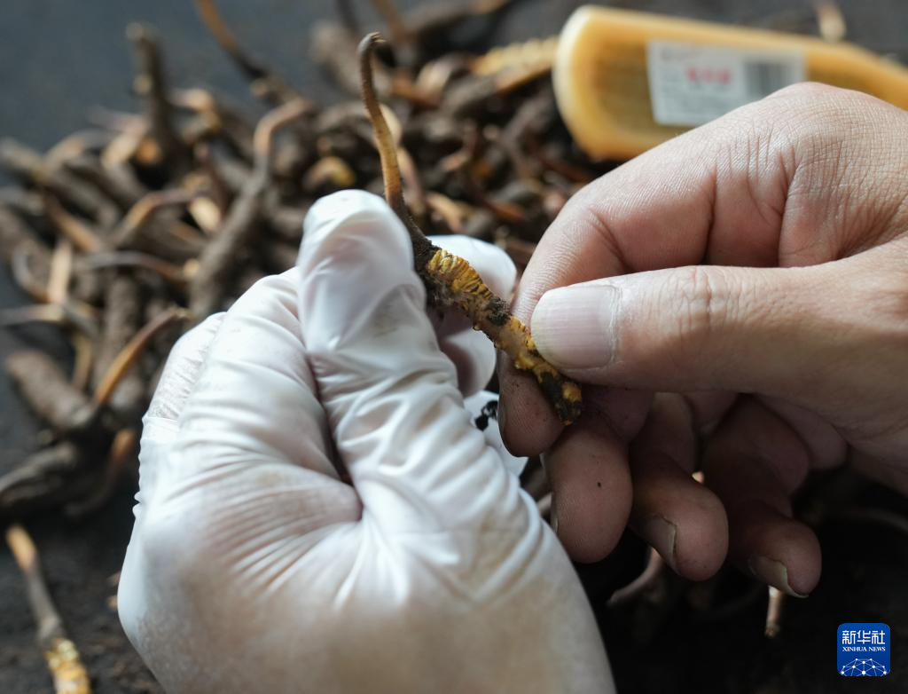5月31日,在西藏拉薩市,藏族青年羅拉在公司內(nèi)清潔新鮮蟲草。新華社記者 丁汀 攝