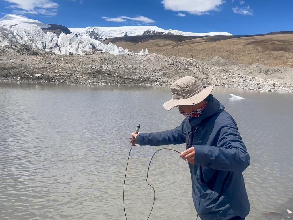 工作人員在措嘉冰川的前緣冰湖收集水位數(shù)據(jù)(6月23日攝)。新華社記者 邱星翔 攝
