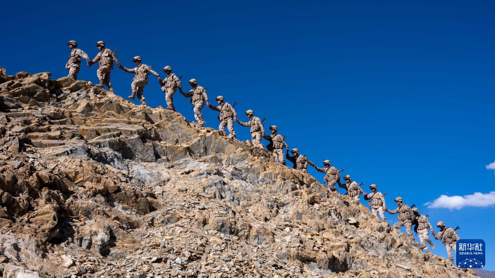 西藏阿里軍分區(qū)普爾楚邊防連秋迪儉革拉哨所巡邏官兵在巡邏途中爬越陡峭山坡(6月29日攝)。新華社發(fā)(戴學武 攝)