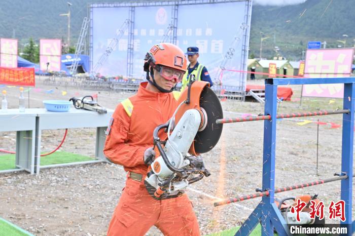 圖為地震救援專業(yè)“兵王”許沖正在操作內(nèi)燃無齒鋸。西藏森林消防總隊(duì)供圖