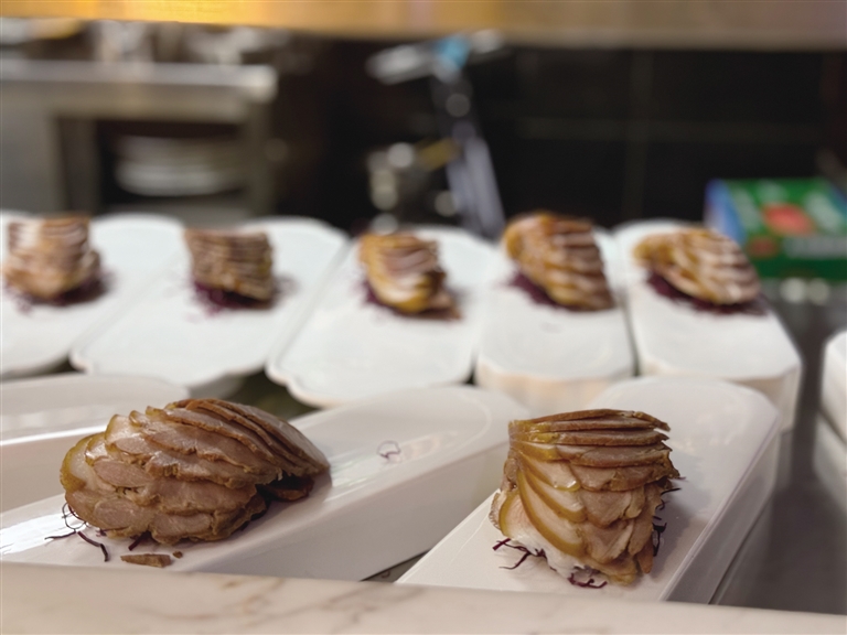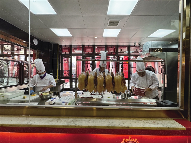 全聚德拉薩店選址于仙足島濱河路二期,店鋪設(shè)計匠心獨運,將古樸典雅的外部風(fēng)貌與簡約優(yōu)雅的現(xiàn)代內(nèi)部裝飾巧妙融合。墻壁上隨處可見的掛畫在介紹著店鋪歷史的同時,更為空間增添了一抹藝術(shù)氣息。開業(yè)當天,隨著歡快的開場舞響起,慶典活動正式拉開帷幕?,F(xiàn)場,片鴨師傅們以精湛的技藝展示著全聚德的獨特魅力,一只只色澤誘人的烤鴨在他們的巧手下化身為薄如蟬翼的鴨肉片,搭配新鮮的蔥絲、黃瓜條及特制甜面醬卷入薄餅中,一口咬下,鮮美與香甜在口中瞬間綻放,令人回味無窮。
