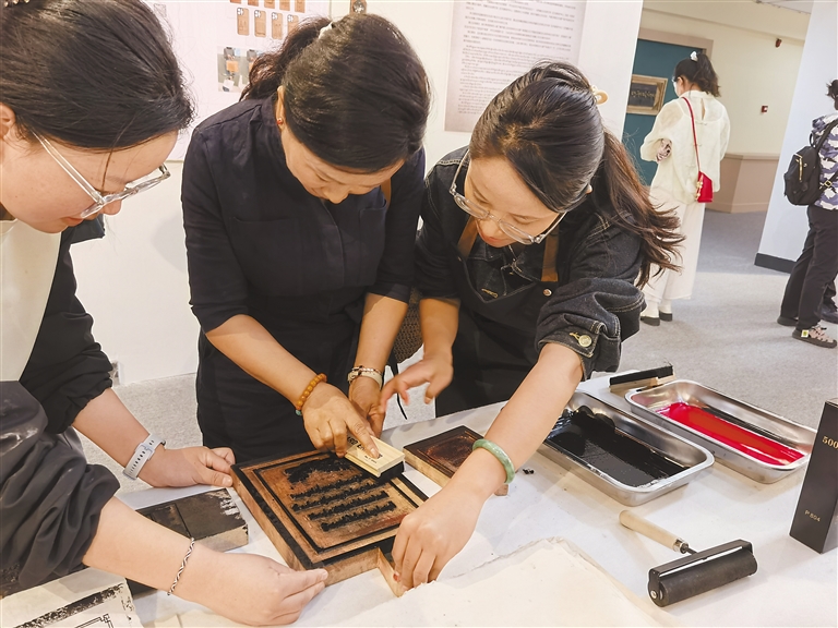 圖為展覽現(xiàn)場,參觀者在體驗(yàn)雕版印刷。記者 鄭璐 袁海霞 攝