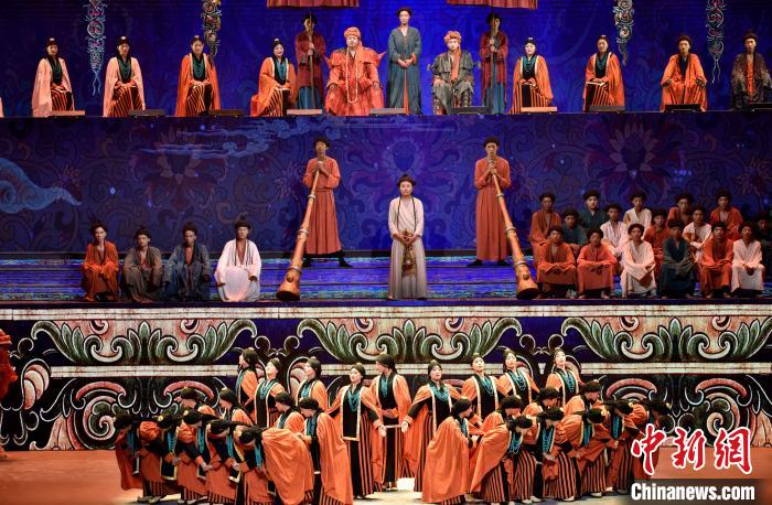 7月19日晚,《緣起象雄·古格遺風》情景歌舞詩劇在西藏拉薩上演。該劇通過歌、舞、詩、畫等多種藝術形式,帶領觀眾身臨其境地感受古象雄文化的獨特魅力和古格王朝的輝煌與傳奇。圖為《緣起象雄·古格遺風》演出現(xiàn)場。中新社記者 李林 攝