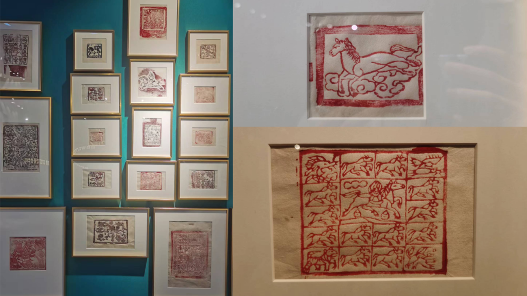 西藏懸掛山間、隨風(fēng)搖曳的成串彩旗,是從古象雄時期留傳至今的祈福物——風(fēng)馬旗。一組來自西藏各地的17件拓片告訴觀眾:古代的風(fēng)馬旗以雕版拓印而成,其上繪馬,有的肅立、有的飛奔,有的高傲、有的溫馴,種種儀態(tài)不一,還有的和龍鳳虎獅一起嬉戲。