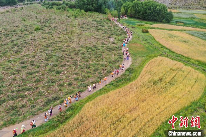 7月24日,西藏拉薩市曲水縣南木村迎來了一年一度的“望果節(jié)”。當(dāng)日,村民們盛裝打扮背上經(jīng)文,圍繞全村田園轉(zhuǎn)上一圈,轉(zhuǎn)到每一塊農(nóng)田前都要煨桑祈求風(fēng)調(diào)雨順、五谷豐登?!巴?jié)”民俗已有1500多年的歷史,是國家級非物質(zhì)文化遺產(chǎn)。圖為曲水縣南木村村民身著盛裝背上經(jīng)文繞田。(無人機照片)中新社記者 貢嘎來松 攝