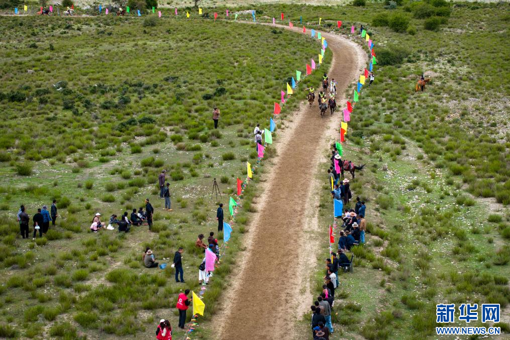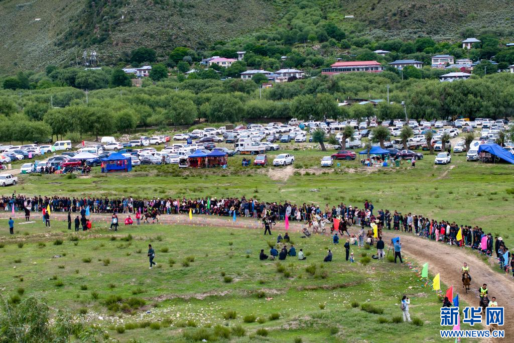 西藏林芝市林芝鎮(zhèn)第七屆尼洋旅游文化之民俗賽馬藝術(shù)節(jié)活動現(xiàn)場(7月22日攝,無人機照片)。新華網(wǎng) 旦增努布 攝