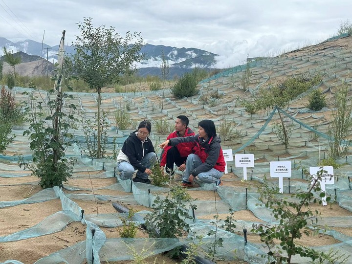 中國科學(xué)院成都山地災(zāi)害與環(huán)境研究所研究員周萍帶領(lǐng)研究生在西藏扎囊縣沙化土地生態(tài)治理綜合示范區(qū)開展沙地試驗(yàn)樣方植被生長狀況監(jiān)測(cè)。新華社記者 顧天成 攝