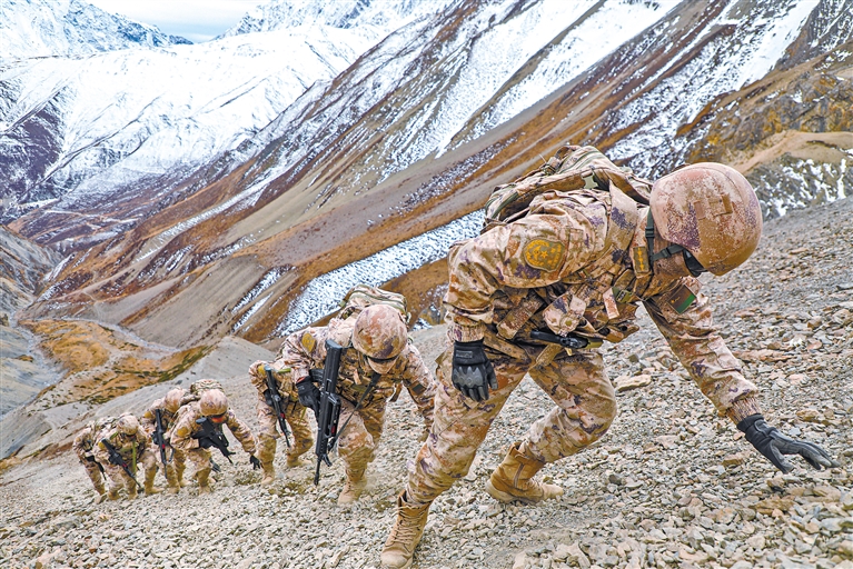 圖為駐藏某部官兵巡邏途中攀爬碎石坡。崔運(yùn)紅 攝