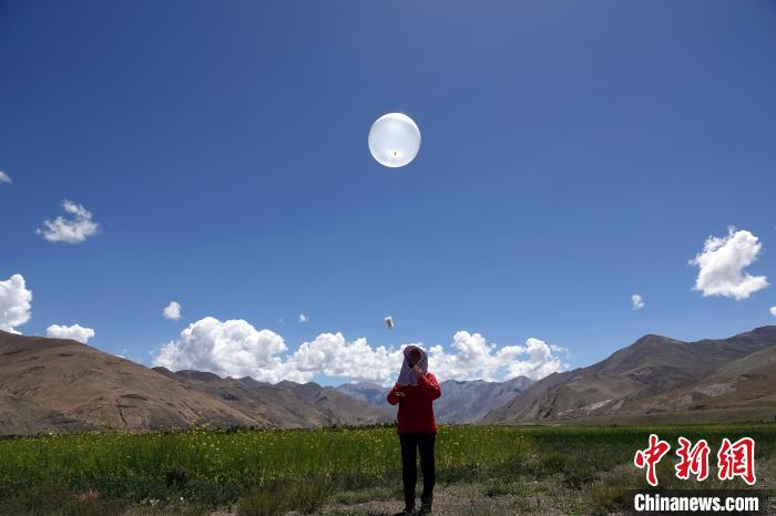 8月1日,作為二次青藏科考一項(xiàng)重要組成部分,珠峰地區(qū)首次開展航空平臺水-熱-碳通量觀測試驗(yàn)正式啟動,圖為科考隊(duì)員施放觀測氣球。中新網(wǎng)記者 孫自法 攝