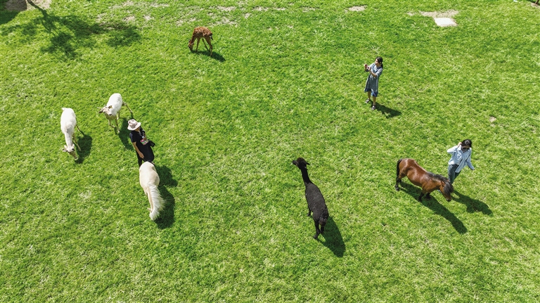 隨著車輪的滾動(dòng),我們緩緩駛?cè)肓嗣葘檲@,正巧看到了柵欄內(nèi)兩只一棕一白憨態(tài)可掬的羊駝,正在不緊不慢地享受著游客的投喂,身旁一只剛出生的小羊駝依偎在媽媽的懷中。此時(shí),一名小朋友追著好動(dòng)的矮腳馬想要騎兩圈,奈何矮腳馬活潑好動(dòng),小朋友幾番努力下都沒能如愿,真是可愛極了。柵欄內(nèi)還有幾只四角綿羊正悠閑地吃著青草,沐浴陽光。記者看到,在萌寵樂園孩子們可以在家長的陪伴下,近距離接觸這些萌寵,親手喂食、撫摸,感受生命的奇妙與溫暖。