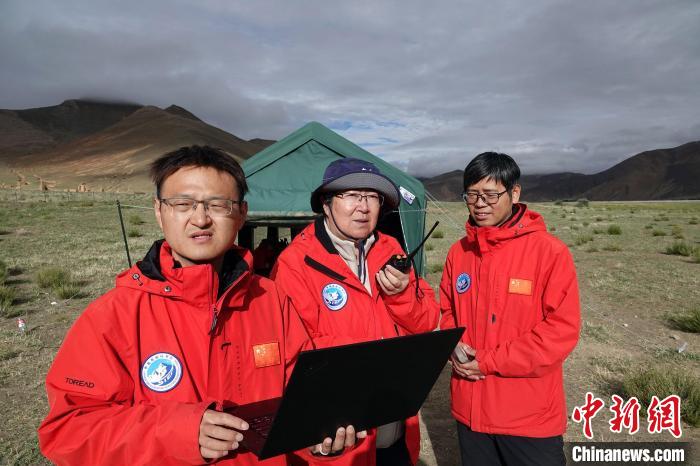 8月8日,珠峰地區(qū)試驗團隊負責(zé)人賈立研究員(中)和隊員鄭超磊副研究員(右)、蔣敏助理研究員在試驗場交流,與無人機起降點工作人員聯(lián)系。中新網(wǎng)記者 孫自法 攝