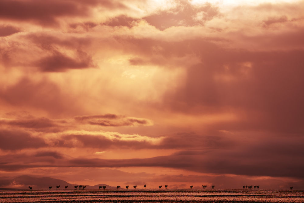 2024年6月15日清晨雪后,在西藏羌塘國家級自然保護(hù)區(qū),一群藏羚羊迎著朝霞前行在遷徙路上。