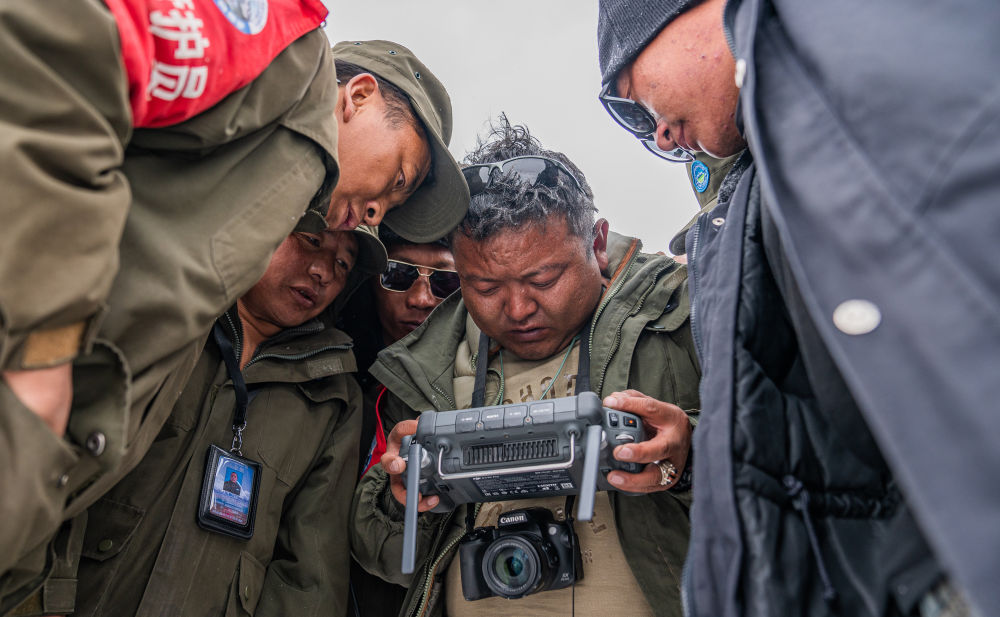 2024年5月10日,在西藏羌塘國家級自然保護(hù)區(qū),羅布玉杰管護(hù)站站長格桑倫珠(右二)和隊員們在大雪中操作無人機觀察藏羚羊遷徙情況。