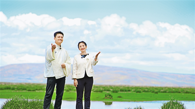 圖為色尼區(qū)文化和旅游局副局長(zhǎng)塔巴曲珍(右)與歌手羅布桑珠錄制宣傳視頻。記者 萬靖 攝