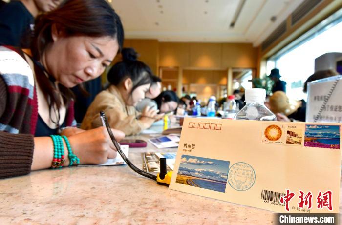 圖為游客在購買《美麗中國(四)》郵票、首日封、紀(jì)念封等產(chǎn)品后,現(xiàn)場填寫。李林 攝