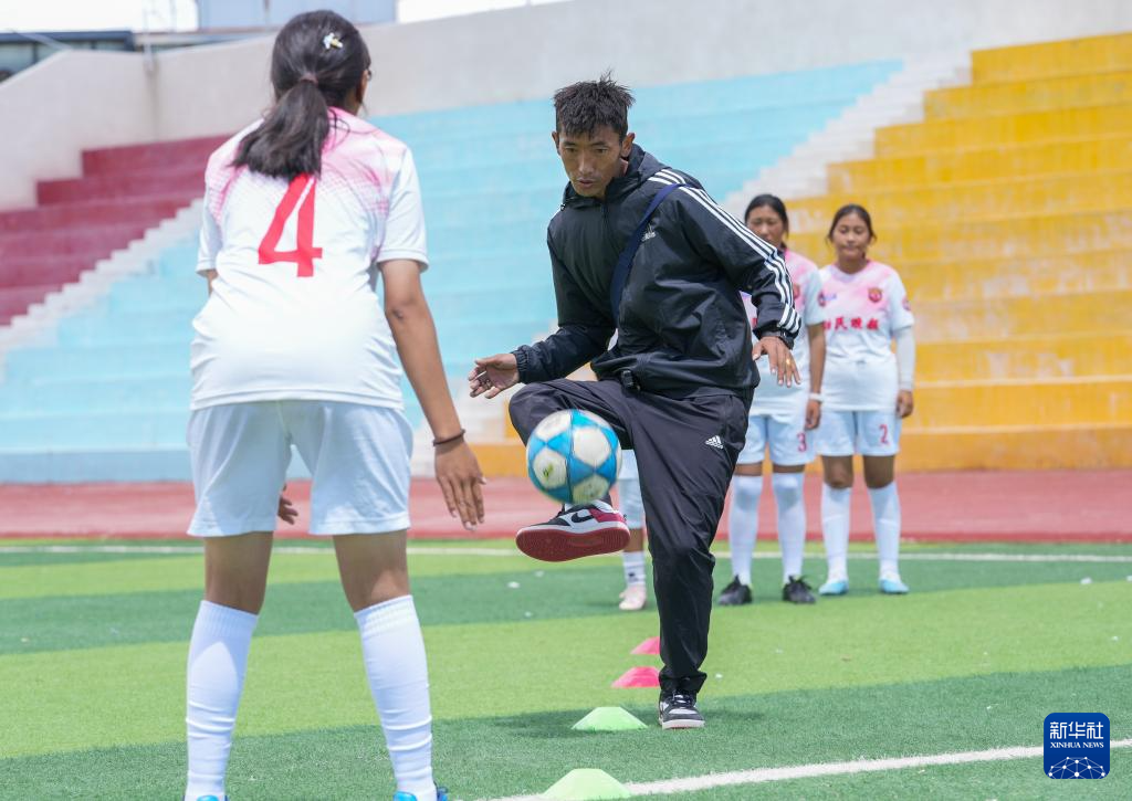 西藏日喀則市上海實驗學(xué)?!爸榉逖棥迸幼闱蜿牻叹毬宀忌#ㄖ校┰诓賵錾现笇?dǎo)球員訓(xùn)練(9月3日攝)。新華社記者 丁汀 攝