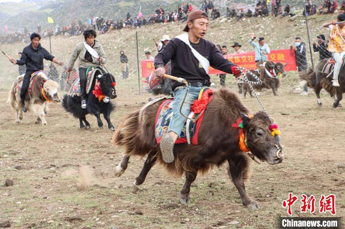 賽牦牛活動(dòng)現(xiàn)場(chǎng),牧民將自家的牦牛精心打扮,信心滿滿地走上起跑線,一聲令響,眾騎手驅(qū)牛疾馳?,F(xiàn)場(chǎng)呼聲陣陣,高潮迭起,為每一頭疾馳的牦牛加油歡呼。