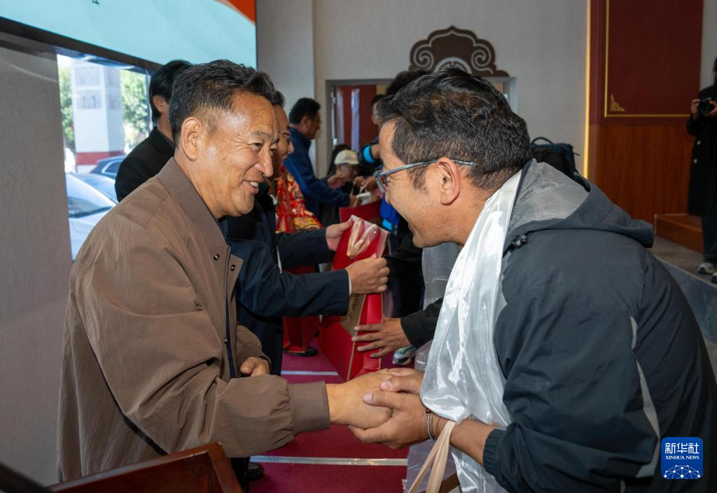 9月13日,參會(huì)專家向《格薩爾王傳》系列叢書編輯人員敬獻(xiàn)哈達(dá)。新華社記者 旦增尼瑪曲珠 攝