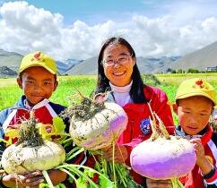 在珠峰腳下的田地里,生態(tài)學專家和學生們一起展示收獲的蕪菁。新華社發(fā)