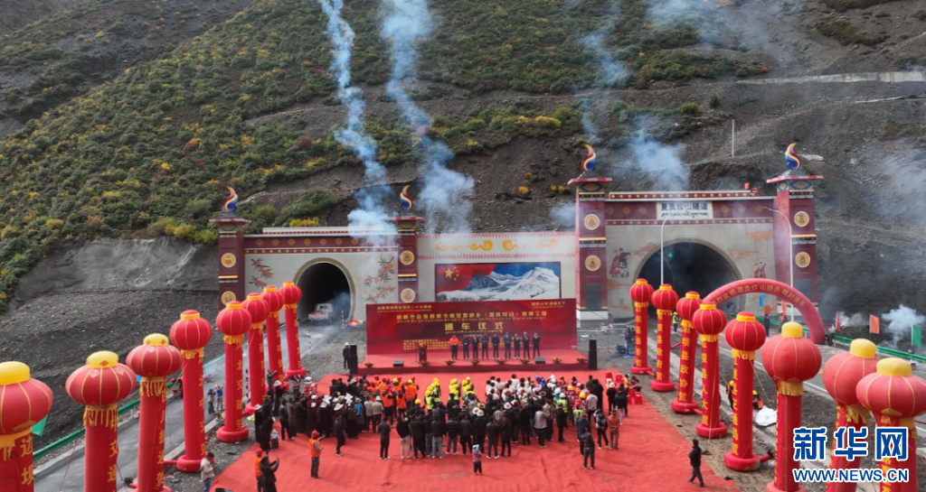 這是夏貢拉山隧道通車儀式現(xiàn)場(9月29日攝,無人機(jī)照片)。新華社發(fā)