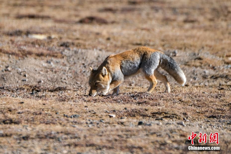 圖為10月3日,西藏那曲雙湖縣的草原上,一只藏狐正在嗅草原鼠兔的洞穴,尋找獵物。中新社記者 江飛波 攝