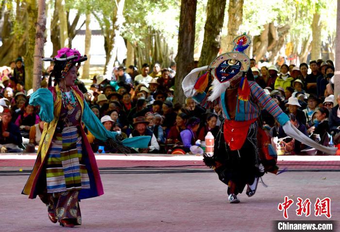 10月7日,西藏自治區(qū)日喀則市扎什倫布寺內上演傳統(tǒng)八大藏戲之一《諾桑王子》,吸引僧俗民眾觀看。藏戲集說唱、表演、歌舞、文學于一體,有著600多年歷史,被譽為藏文化的“活化石”。中新社記者 李林 攝