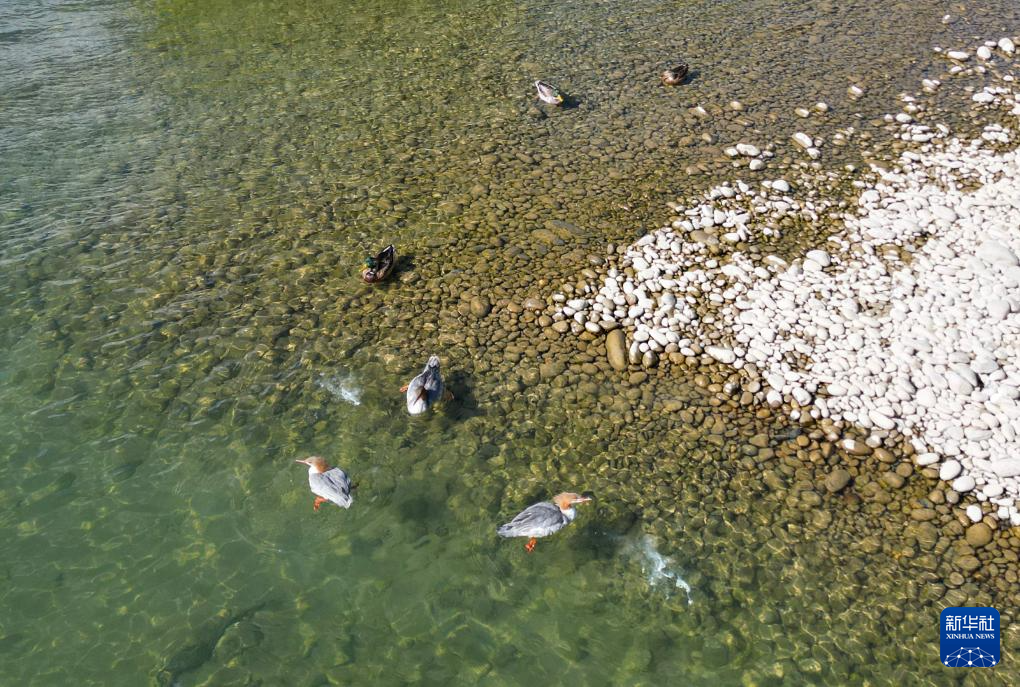 在林芝雅尼國家濕地公園內(nèi),不同種類的野生鳥類棲息在尼洋河畔(10月24日攝,無人機照片)。新華社記者 劉天宇 攝