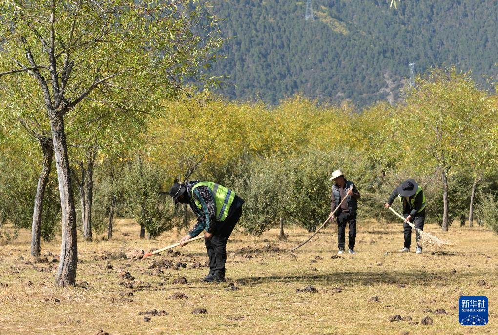 在西藏林芝雅尼國家濕地公園內(nèi),濕地管護隊員們進行每日的例行清理維護(10月24日攝)。新華社記者 李賀 攝
