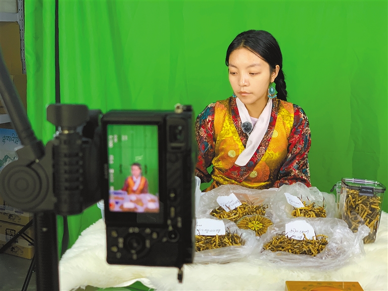 網(wǎng)紅“那曲拉姆”的原型系那曲市巴青縣瑪如鄉(xiāng)姑娘索朗巴央,在全網(wǎng)有400多萬粉絲。索朗巴央自2023年5月5日直播銷售牛肉干、藏紅花等,促進(jìn)本地特產(chǎn)銷售,增加農(nóng)牧民收入?!D為“那曲拉姆”在直播間介紹西藏特產(chǎn)。受訪者提供