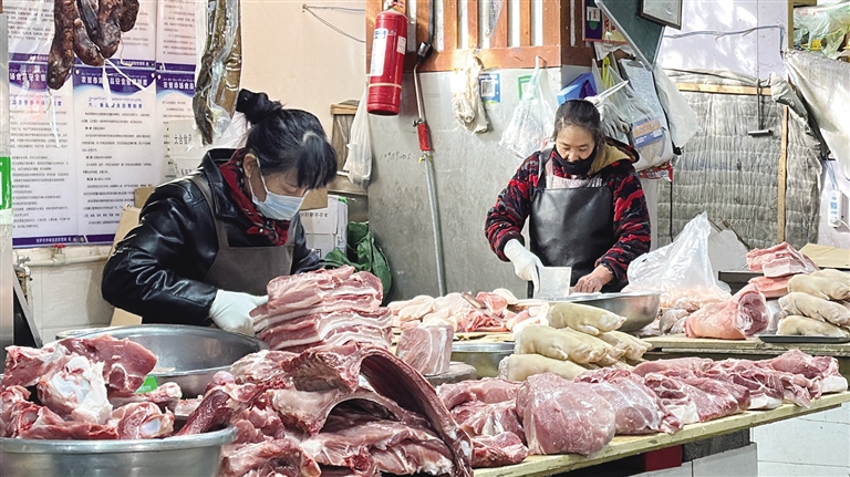 納金綜合批發(fā)商貿城豬肉攤店老板魏女士介紹,目前豬肉銷量上漲,價格和之前相差不多,其中冷鮮豬排每斤28元、豬五花肉每斤18元、豬棒骨每斤10元、豬里脊(不帶皮)每斤16元,新鮮香腸每斤40元。她告訴記者:“我們店的豬肉質量很好,賣得特別好,平時除了賣給散客外,也經常有餐飲店來我們這訂購豬肉。”除了豬肉,牛羊肉的價格也較為平穩(wěn),其中牛肉每斤40元左右、牛排每斤35元左右、羊肉和羊排每斤都是35元左右。此外,雞鴨鵝等禽類商品銷量上漲,價格基本與前幾月持平。