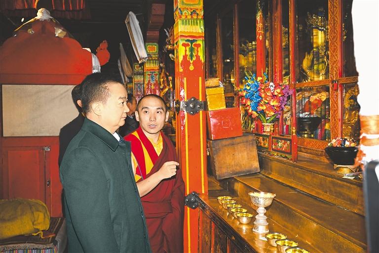 王君正深入寺廟開展調(diào)研,與僧尼親切交流。扎西吉培寺坐落于謝通門縣,歷史悠久、氣勢恢宏。王君正來到這里,詳細了解該寺加強和創(chuàng)新寺廟管理、寺廟歷史、文物保護等情況,聽取“三個意識”教育工作開展情況匯報。指出,要進一步深化拓展“三個意識”教育,總結提升好經(jīng)驗好做法,對該寺結合實際建立“六項機制”,完善僧尼綜合考核,推動僧尼實現(xiàn)自我教育、自我管理、自我約束等工作進行總結提煉、不斷完善;依法加強宗教事務管理,掌握宗教工作科學方法,推動宗教事務管理法治化、規(guī)范化、常態(tài)化,強化寺管會工作職能,加強寺管會干部隊伍建設,推動宗教工作由“管得住”向“管得好”轉(zhuǎn)變。王君正在考察了解到該寺珍藏著《甘珠爾》《丹珠爾》等文物古籍時指出,要加強文物古籍保護利用,切實提高文物保護的科技含量和裝備水平,讓珍貴古籍、文物資源煥發(fā)新生、世代傳承,留住歷史的痕跡和文明的根脈。王君正對該寺組織僧尼前往區(qū)外學習參觀感到高興,指出,加強西藏宗教界與區(qū)外交流學習是鑄牢中華民族共同體意識的具體體現(xiàn),對于深入推動各民族交往交流交融將起到積極促進作用,必將進一步構筑中華民族共有精神文化家園。