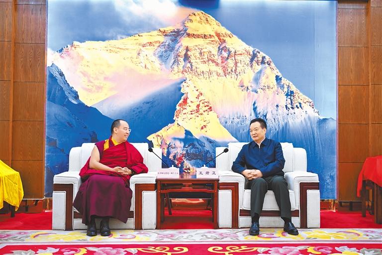 調(diào)研結束后,王君正在日喀則市會見了班禪額爾德尼·確吉杰布,對其在藏各項活動的順利開展、圓滿成功表示祝賀。王君正指出,班禪額爾德尼·確吉杰布回藏履職以來,深入貫徹習近平總書記關于宗教工作、西藏工作的重要指示和新時代黨的治藏方略,深入學習宣傳“三個意識”,廣泛接觸基層干部群眾和寺廟僧尼,積極宣傳黨的民族宗教政策,在推進藏傳佛教中國化、鑄牢中華民族共同體意識、引導信眾投身社會主義現(xiàn)代化新西藏建設等方面做了積極有效的工作。希望班禪額爾德尼·確吉杰布進一步學習領會習近平總書記重要指示精神,堅定不移維護祖國統(tǒng)一、加強民族團結,全力維護社會和諧穩(wěn)定的良好局面;堅定不移推進藏傳佛教中國化,對教規(guī)教義作出通俗易懂、與時俱進的闡釋;堅定不移深化拓展“國家意識、公民意識、法治意識”教育,把各方面力量凝聚起來,奮力推進社會主義現(xiàn)代化新西藏建設。
