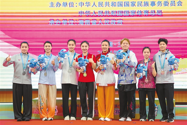 獲獎選手在頒獎儀式上合影,其中西藏代表團選手趙爽(左四)獲得女子傳統(tǒng)雙器械一等獎。新華社記者 張麗蕓 攝