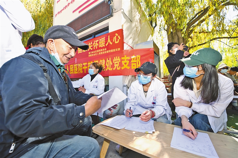 拉薩市策門林社區(qū)居民委員會聯(lián)合自治區(qū)人民醫(yī)院干部保健處黨支部在宗角祿康公園開展義診活動。記者 唐斌 攝