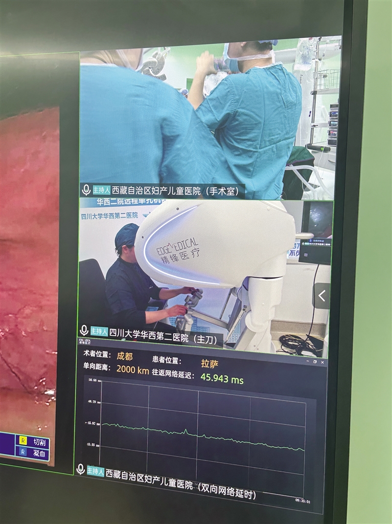 梅玲介紹,此次手術(shù)是與四川大學(xué)華西第二醫(yī)院聯(lián)合開展的,由四川大學(xué)華西第二醫(yī)院的鄭瑩教授團(tuán)隊主刀,并依托華西的先進(jìn)技術(shù)平臺,通過遠(yuǎn)程方式完成手術(shù)。手術(shù)結(jié)束后,鄭瑩教授通過視頻向大家介紹,這場跨越2000公里距離與3000米海拔差異的手術(shù),總共用時1小時45分鐘,網(wǎng)絡(luò)延遲僅40毫秒?!按舜问中g(shù)的成功為今后更多優(yōu)質(zhì)資源技術(shù)送達(dá)偏遠(yuǎn)地區(qū)提供了重要參考,也為提高西藏醫(yī)療水平打下了堅實的基礎(chǔ)。”鄭瑩說。