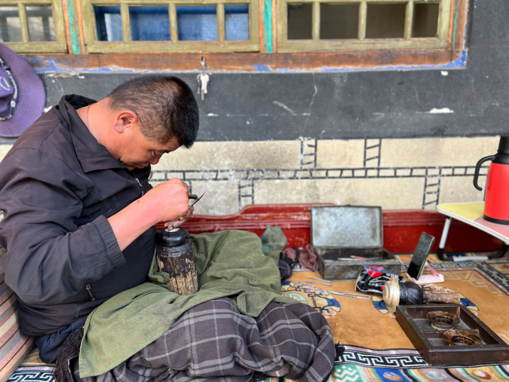 在工布次仁旁邊,另一位古藝大師邊巴扎西正在制作一件銀器。這是一件茶托,湊近看,隱約能看見密密麻麻的小點(diǎn),這是敲擊留下的印記。邊巴扎西把茶托罩在一根豎起的木棍上,繼續(xù)給它塑形。簡單樸素的制作工具背后,是執(zhí)著的匠心。