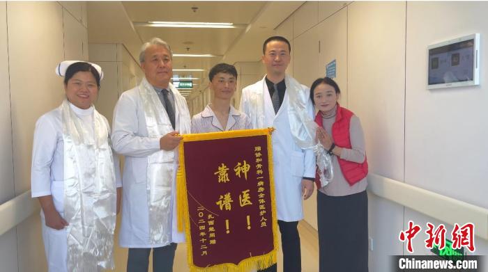12月3日,在北京協(xié)和醫(yī)院接受脊柱側(cè)彎矯形手術(shù)的藏族青年扎西能周(右三)和母親(右一)向醫(yī)院骨科一病房的醫(yī)護人員獻哈達并送上錦旗。黃欣欣 攝