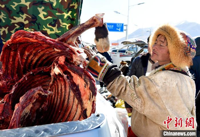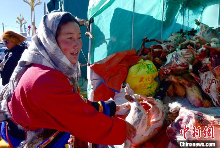 12月6日,西藏那曲市申扎縣第十八屆畜產(chǎn)品展銷會正式開幕,40余家優(yōu)質(zhì)牧民合作社和企業(yè)帶著畜產(chǎn)品、手工藝品等當?shù)靥厣a(chǎn)品參展,現(xiàn)場人頭攢動、購銷兩旺。圖為展銷會現(xiàn)場,買賣雙方商談羊肉價格。中新社記者 李林 攝